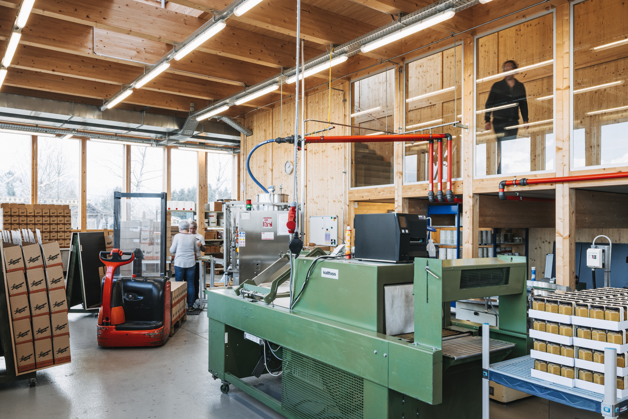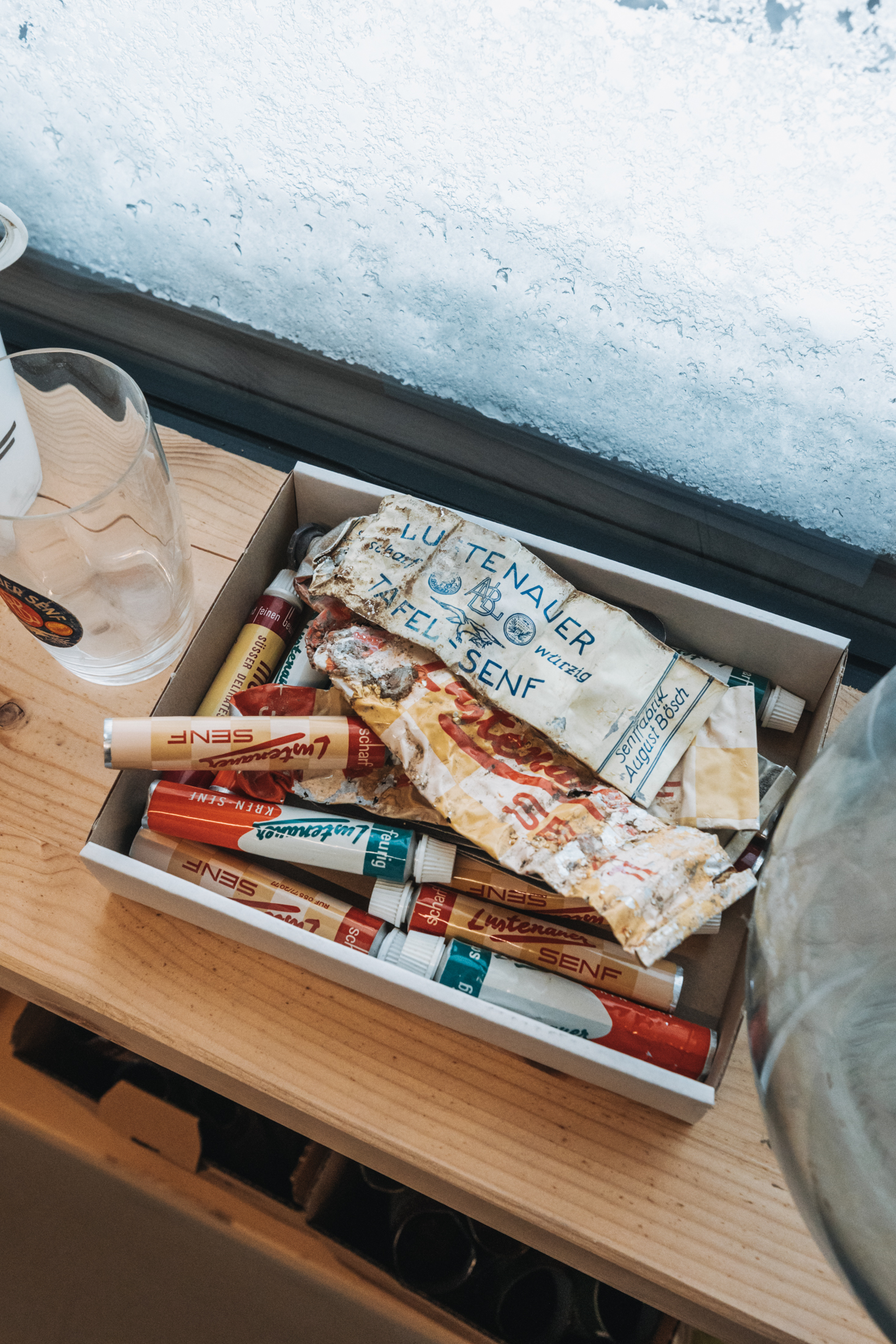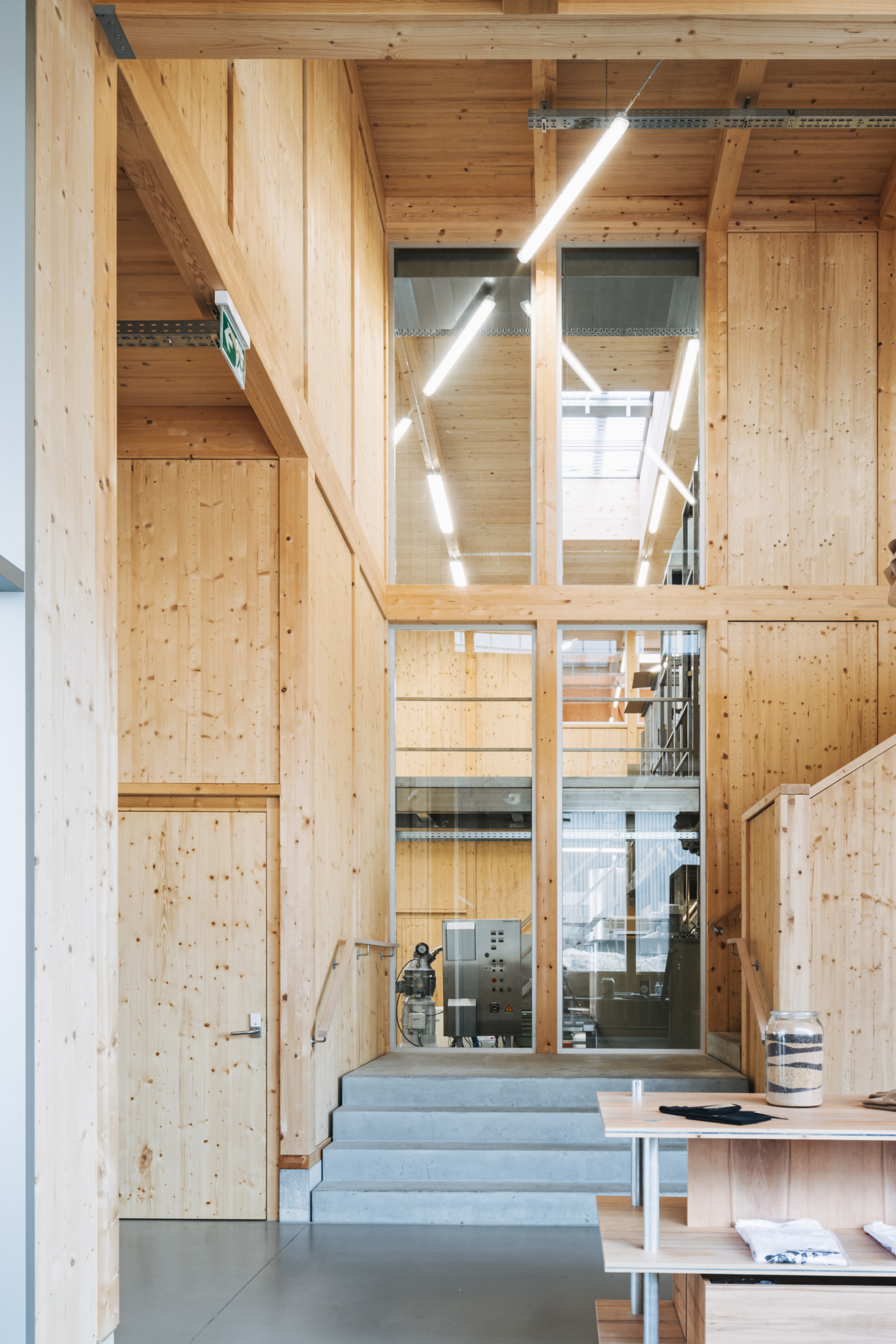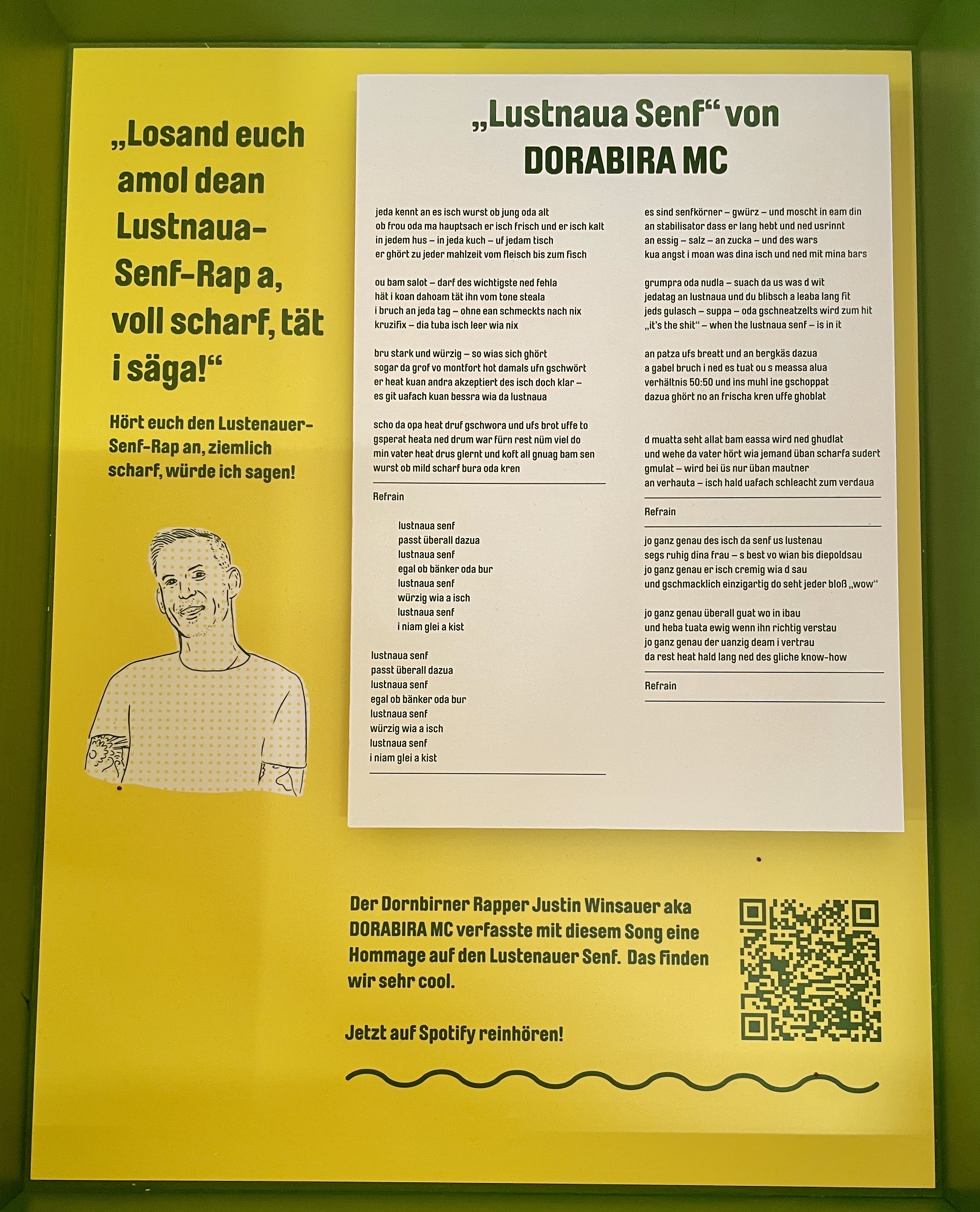 Uns erinnert die Architektur mit dem Atrium, das den Klang der Gespräche aus dem Senfladen in das obere Stockwerk trägt, an ein Holzinstrument. Dabei wäre eher die Klarinette für das Unternehmen bezeichnend, sie findet sich sogar im Senfmuseum, das mit historischen Informationen und Senfsäcken zum Reingreifen in einem Rundgang durch Lagerraum und Produktion zu mäandern scheint. Am Ende des Rundgangs gelangt man zu einer Kommode, die neben der Klarinette u.a. auch einen QR-Code beinhaltet, der auf den Vorarlberger Mundart Song LUSTNAUA SENF des Dornbirner Rappers Justin Winsauer aka DORABIRA MC verweist. Zufällig entdeckten die Böschs die Hommage an ihre Marke, deren Tradition und Verwendung und integrierten sie kurzerhand in ihr Museum.
